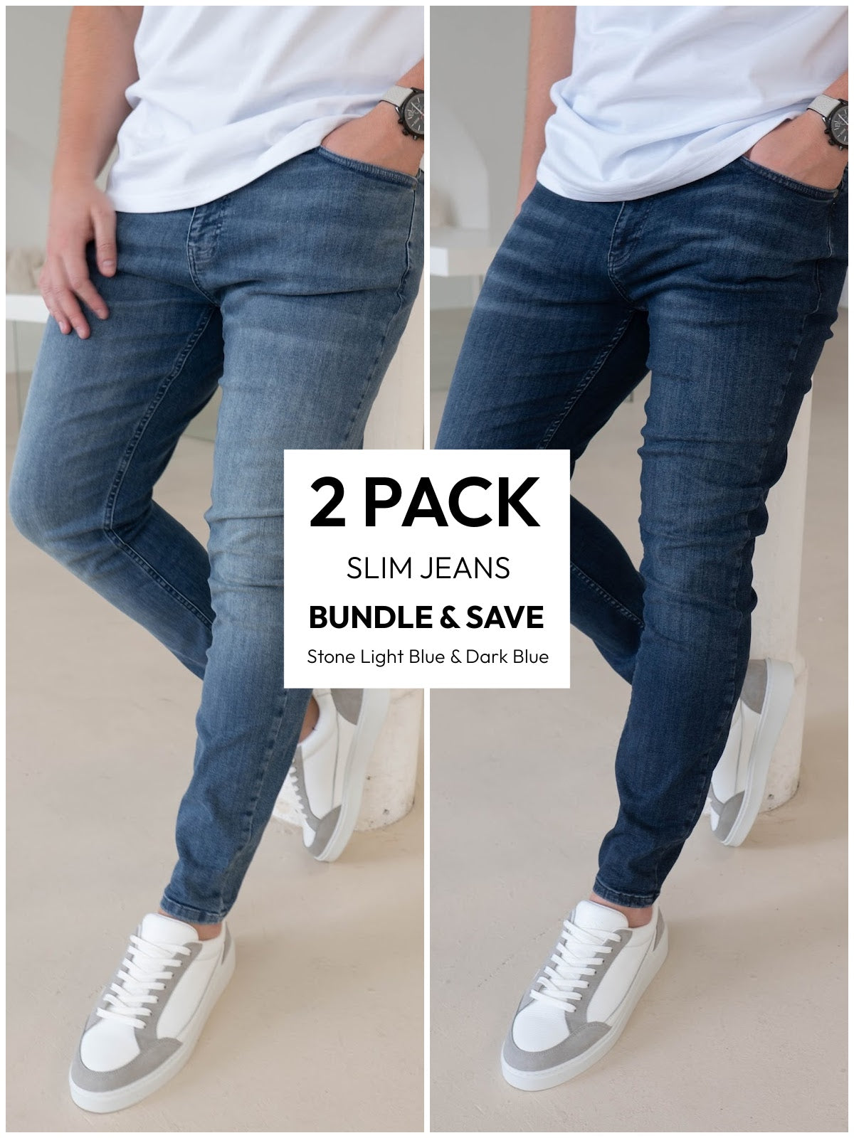 A 2 pack of our best selling Slim Comfort Jeans. In Stone light blue & Dark Blue.